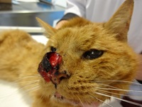 Figuur: De kat linksboven en de kat rechtsboven heeft een plaveiselcelcarcinoom van het planum nasale; de kat linksonder heeft een plaveiselcelcarcinoom van de mondhoek; de kat rechtsonder een plaveiselcelcarcinoom van de oogleden
