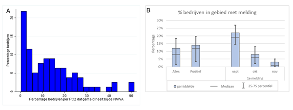 Figuur 3. Het percentage bedrijven dat melding heeft gemaakt bij de NVWA van kliniek indicatief voor BTV-3 weergegeven als histogram (A) en als gemiddelde percentage over postcodegebieden heen (B) in 2023.