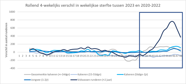 Figuur 9. Verschil in aantal per week gestoven runderen in verschillende leeftijdscategorieën tussen 2023 en de voorgaande periode (2020-2022) weergegeven als rollend vierwekelijks gemiddelde.