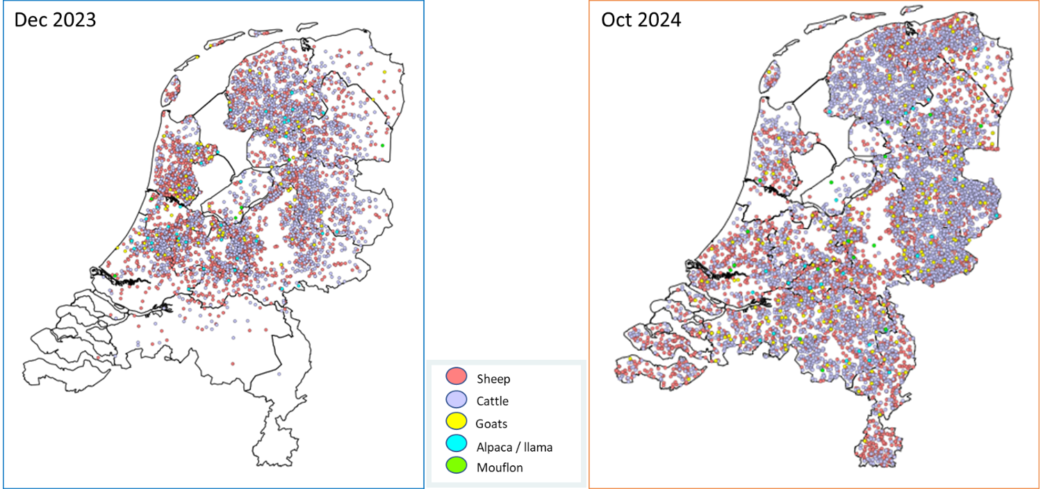 Vanaf 5 september 2023 is Nederland besmet met blauwtong serotype 3. Nederland verloor daarmee haar vrij-status. In de uitbraak die volgde werden er meer dan 5000 geïnfecteerde bedrijven gemeld en in 2024 meer dan 10.000. BTV heeft zich in 2023 en 2024 over het hele land verspreid (zie figuur 1).