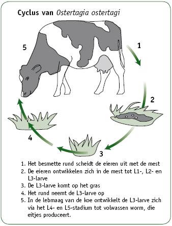 Een volwassen (maagdarm)worm produceert, afhankelijk van de soort, per dag tot 10.000 eieren. Uit de eieren ontwikkelen zich larven (L1), die zich op het weiland in een periode van 2 tot 3 weken ontwikkelen tot infectieuze L3-larven. De snelheid van de ontwikkeling is afhankelijk van de vochtigheid van de omgeving en de temperatuur. Grazende runderen nemen besmettelijke L3-larven op met het gras, waarna de L3-larve zich in de lebmaag via een L4 en L5-stadium verder ontwikkelt tot een volwassen worm (O. ostertagii).