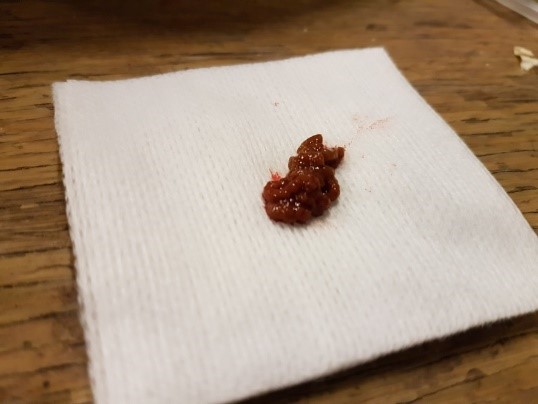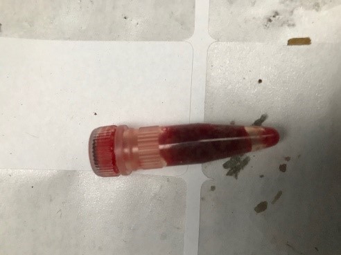 - Let ook op dat u het biopt eerst op een gaasje uit laat lekken, zodat het bloed in het gaasje terecht komt en u zoveel mogelijk zuiver levermateriaal in het cupje terechtkomt.