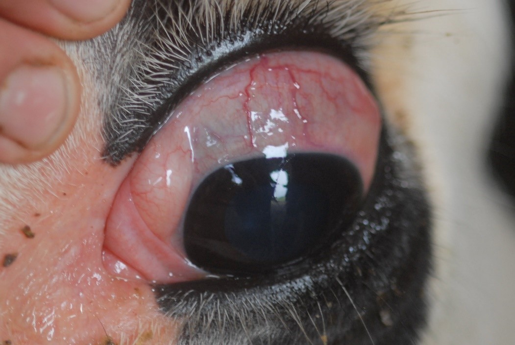 Verhoogde doorbloeding en oedeem van de slijmvliezen van het oog bij een rund