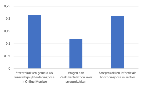 Figuur: Het percentage meldingen in de Online Monitor waarbij streptokokken als waarschijnlijkheidsdiagnose zijn aangegeven, het percentage vragen over streptokokken, en in de laatste kolom het percentage secties waarbij streptokokken infectie als hoofddiagnose is vermeld (eerste halfjaar 2024).