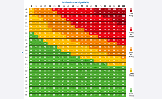 Bekijk hieronder de adviezen en achtergrond informatie per mate van hittestress. De hittestresscheck kent de volgende categorieën. Deze zijn herkenbaar aan de volgende kleuren.
