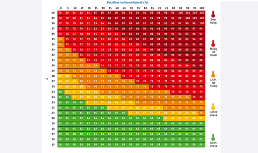 Bekijk hieronder de adviezen en achtergrond informatie per mate van hittestress. De hittestresscheck kent de volgende categorieën. Deze zijn herkenbaar aan de volgende kleuren.