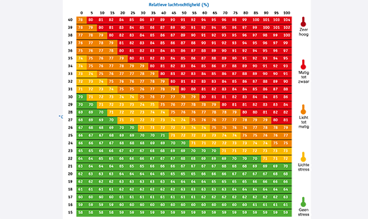 Bekijk hieronder de adviezen en achtergrond informatie per mate van hittestress. De hittestresscheck kent de volgende categorieën. Deze zijn herkenbaar aan de volgende kleuren.