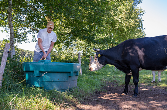 Voor het drinkwater van de koeien maken ze gebruik van een eigen bron. Het viel Guus op een gegeven moment op dat hij steeds veel zout moest toevoegen. “Daarom heb ik bij GD wateronderzoek laten uitvoeren. Een monster voor en eentje direct na de ontijzerings- en ontkalkinstallatie. We gebruiken het water ook in de kassen, dus het moet van goede kwaliteit zijn. In de weide zorgen we ervoor dat het water ook doorlopend de bakken inloopt. Want de koeien drinken veel, helemaal tijdens warme dagen. Het is gelukkig een bosrijk gebied, dus er is altijd wel ergens in de wei schaduw. Daarom weiden we ook op warme dagen. En we controleren de dieren natuurlijk meerdere keren per dag.”