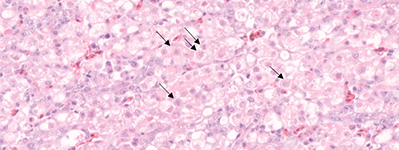 Uitval is al geruime tijd wat verhoogd (0,3 procent per week). Tijdens sectie werden in diverse organen, waaronder lever, kliermaag, milt en in de skeletspieren, witte haarden gevonden.