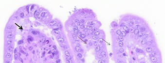 Er werden 4 biggen aangeboden voor onderzoek. De biggen verkeerden in een cachectische voedingstoestand en waren uitgedroogd. De magen waren leeg of bevatten weinig inhoud.