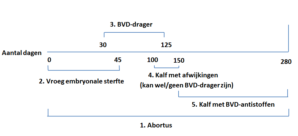 - Geboorte van kalveren met precolostrale antistoffen. Bij infectie tijdens de laatste drie maanden van de dracht is het afweerapparaat zodanig ontwikkeld, dat het kalf een BVD-infectie kan elimineren en antistoffen vormt. Abortus en geboorte van afwijkende of kleine zwakke kalveren is echter nog steeds mogelijk.