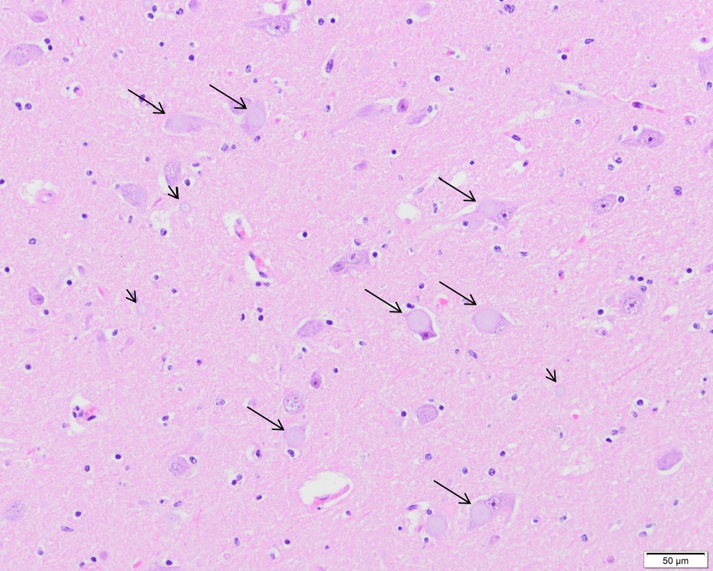 Foto 1. Hersenstam, histopathologie (HE kleuring, 20 x); ronde inclusies aanwezig, bleekgrijs, begrensd, zowel in perikarya (lange pijlen) met verplaatsing van de kern in de neurone. Deze inclusies zijn ook extracellulair aanwezig in de neuropil (korte pijlen).
