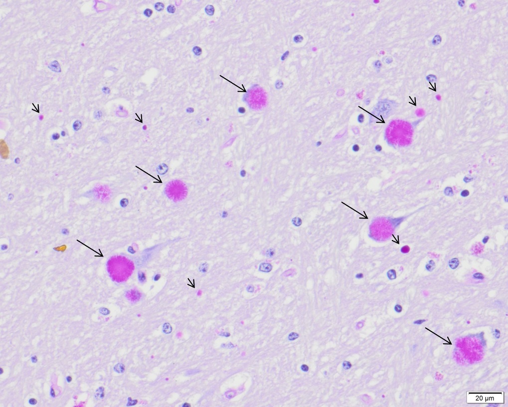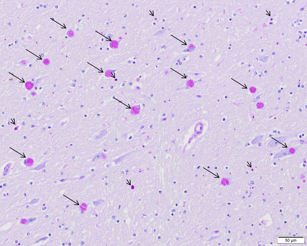Histopathologisch onderzoek hersenen: in de hersenstam zijn verspreid ronde inclusies aanwezig, bleekgrijs, begrensd, zowel in perikarya met verplaatsing van de kern, als extracellulair in de neuropil. De inclusies zijn PAS- en PAS-diastase positief, morfologisch passend bij polyglucosan inclusies. Deze inclusies worden ook wel Lafora bodies genoemd. Hoewel enkele Lafora bodies normaal kunnen zijn bij oudere dieren, zijn grote aantallen zoals in dit geval (zie foto 1-3) passend bij Lafora disease. Tevens toename van het aantal microglia cellen. Slokdarm: verspreid enkele rondcellige ontstekingshaardjes ter plaatse van de nerveuze plexi van het autonome zenuwstelsel in de submucosa en inwendige gladde spierlaag van de slokdarm, soms gecombineerd met degeneratie/necrose van neuronen.